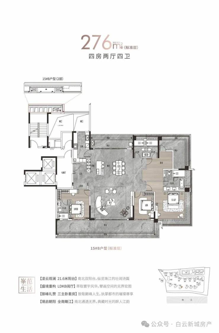 特点:白云首个珠江大平层,超高实用率,4面宽朝南看江,阳台宽达2.2米,高层长度8-9米,大平层长度17-24米,5.7米宽厅尺度市场少有。
