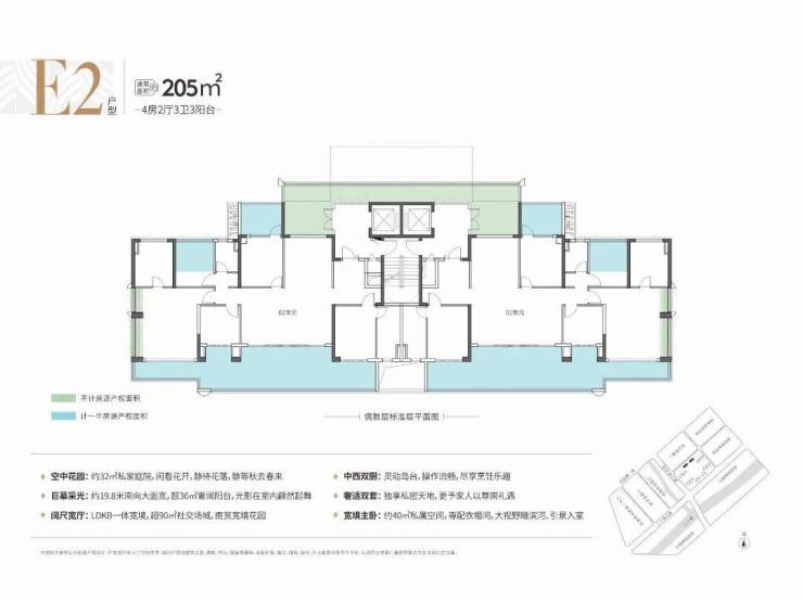 比如建面约205平4房(E2户型),不仅拥有一个约36平的阔绰阳台,还有一个约32平的专属庭院,可以在大平层实现庭院生活理想。