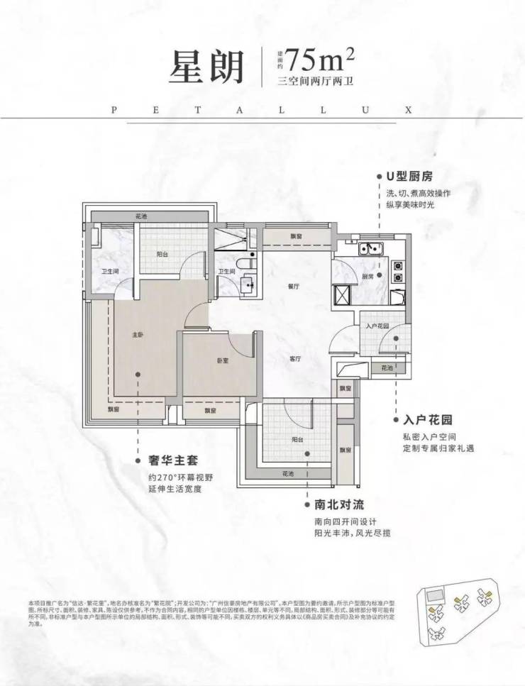 75㎡三房两卫:适合刚需家庭,进门带入户花园,南北通透,布局紧凑合理。