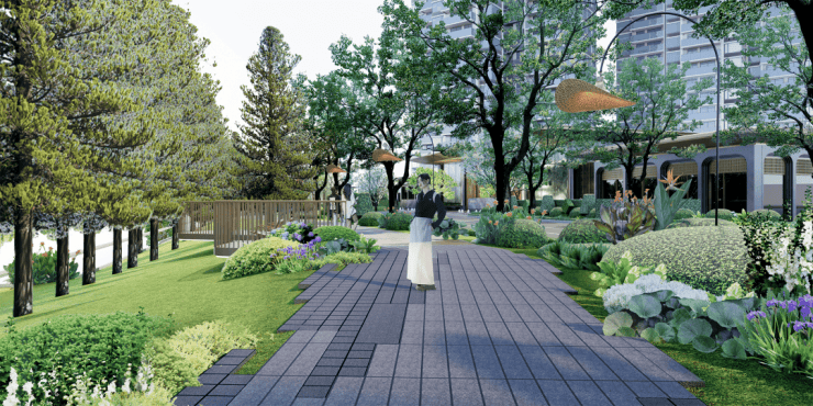项目园林将打造六大社区花园,外部将优化南侧水道,打造一线河景+双公园