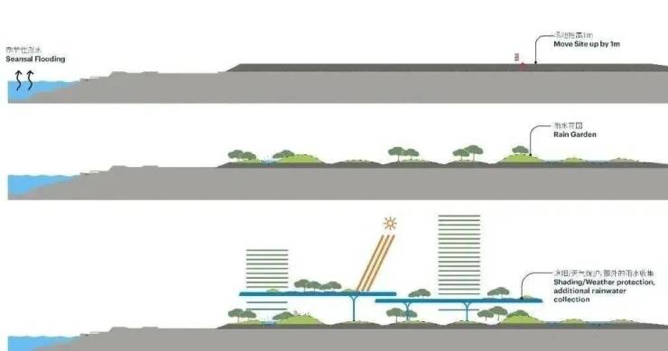 将地面空间开放给行人、绿植,不仅能美化环境,还能很好的应对气候环境所带来的洪涝挑战。(如上图)