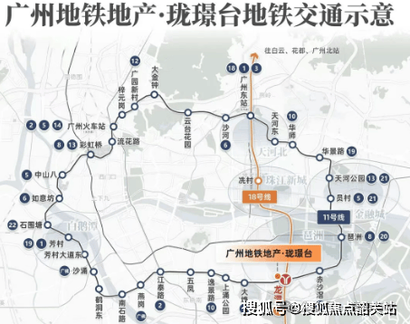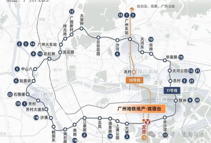 珑璟台的位于11和18号线交汇龙潭站,1站磨碟沙、2站冼村,11号线还是广州首条大环线,19个换乘站点,串联天河、海珠、越秀、荔湾四个主城区以及多个CBD。