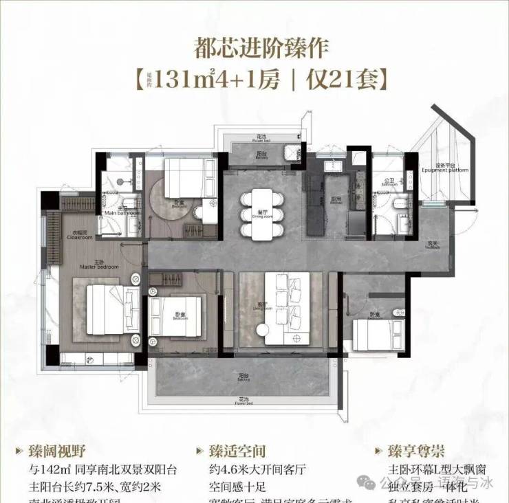 建面131平4+1房,该户型跟之前142平户型有点像,南北对流双阳台,主阳台长达7.5米,约4.6米的客厅开间,加上设备平台的赠送,空间感完全不输160平。