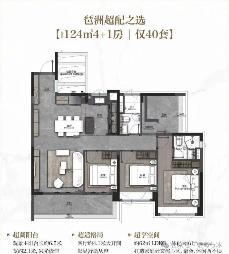 建面124平四房,约6.5米的宽景阳台,客厅开间约4.1米,由于设备平台全赠送做到了大客厅、大阳台之外还能改做4+1房。