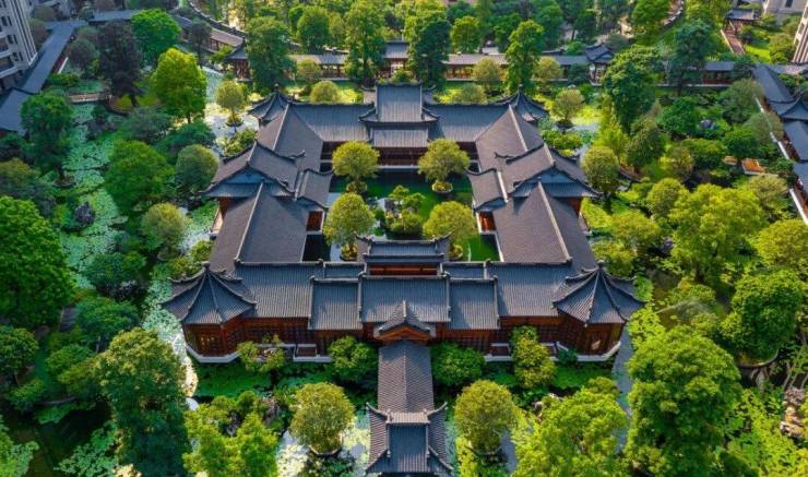 中式园林当代里程碑巨著:江园合一再现唐诗意境,自拥4.6万方水体,参天大树掩映荷塘风雅,千米风雨连廊串连亭台廊轩,非遗香山帮满工雕花精美绝伦,兼顾晋派建筑的恢宏与徽派建筑的精巧,开创了中国园建新里程。