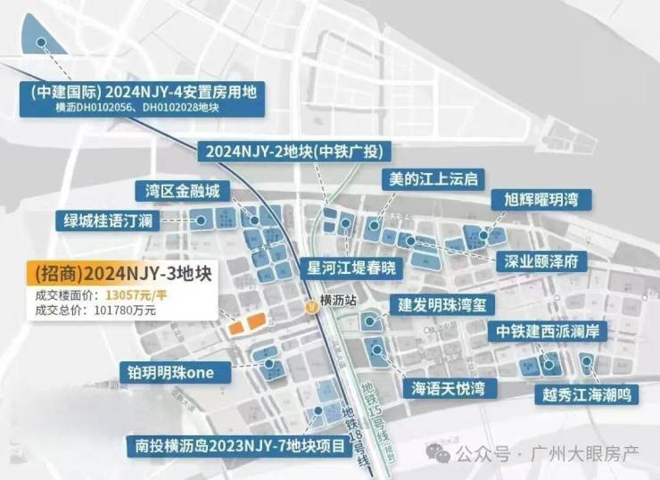 2024年9月20日,广州招盛房地产有限责任公司(招商蛇口)以底价10.18亿元拿下横沥岛2024NJY-3地块,扣除456㎡配建后,成交楼面价约1.3万/㎡。