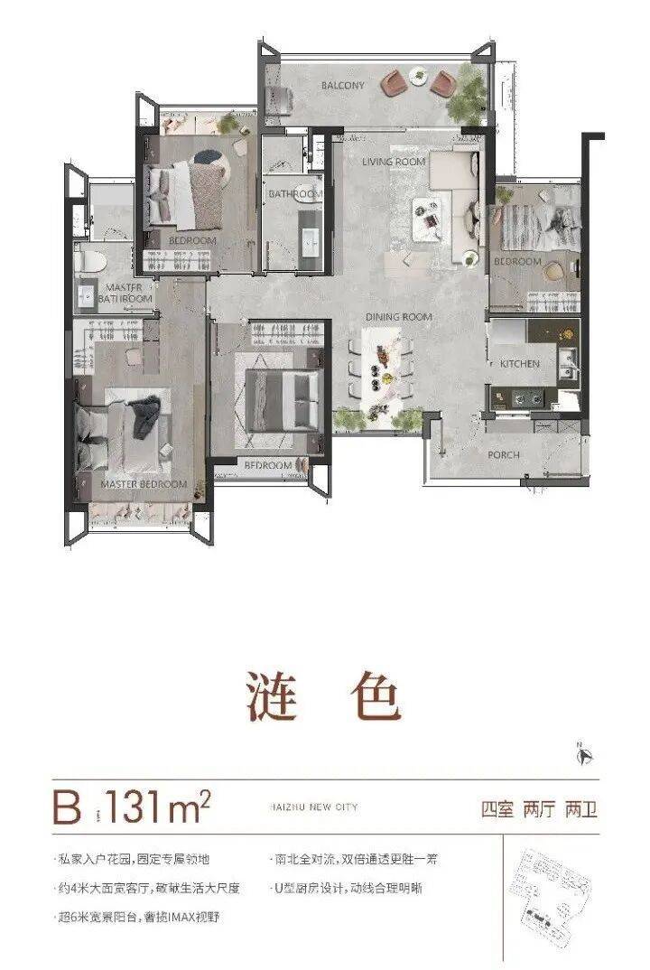 131平B户型,主阳台朝北,但两卧室朝南、两卧室朝北。但是,望海珠湿地公园,景观相对比较好。