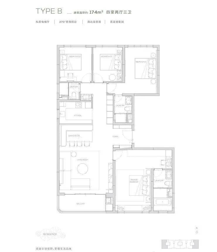 174产品为四房两厅三卫产品,打造了端户边厅布局,形成LDK一体化。无界的室内空间畅游体验,在平淡的日常里体验着生活的华章。