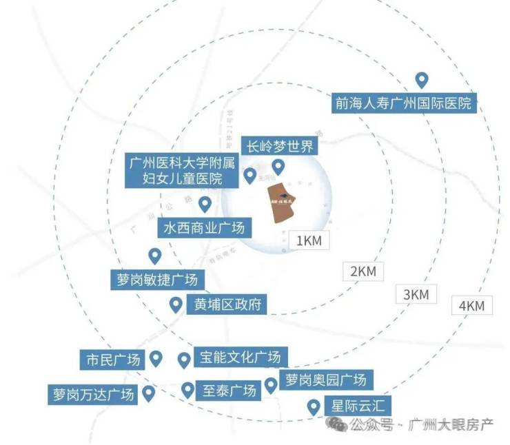 直线距离约800米地铁21号线长平站(走路大概1.1公里),1站黄埔区府(水西站),2站万达广场(苏元站),5站到天河(天河智慧城站);