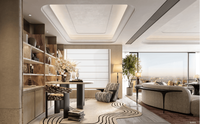从居住体验出发完成了极致优化:既规避了床头正对窗框的尴尬,预留出充足的家具摆放与休闲空间,又实现了无遮挡的双面景观视野——北向直望广州塔、珠江新城天际线,南向正对中轴绿地公园,城市繁华与自然静谧,都被完整地框进了室内。