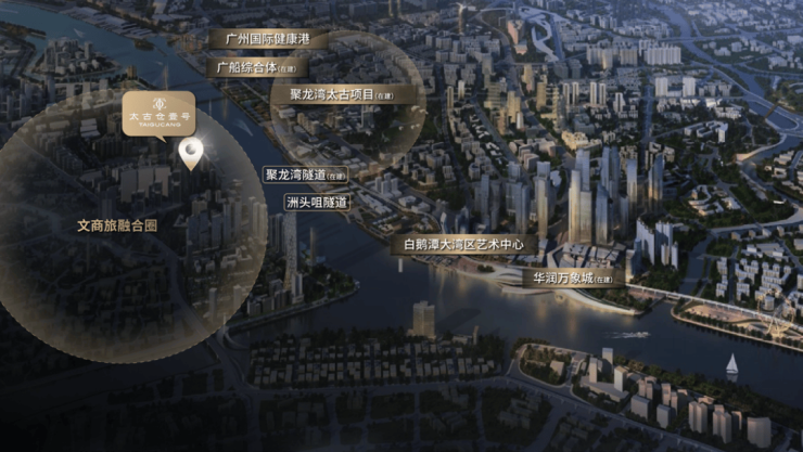 太古仓壹号坐拥传统老中轴延伸优势,串联白鹅潭商务区、聚龙湾综合体和太古仓等城市新人文地标,琶洲、白鹅潭、广钢、广纸等四大繁华商圈环绕,传统与现代兼文商旅圈,形成"水陆双循环"的顶级商圈格局。隔江对望聚龙湾太古、白鹅潭CBD,人文与艺术交相辉映,孕育全球前沿水岸生活的世界橱窗。
