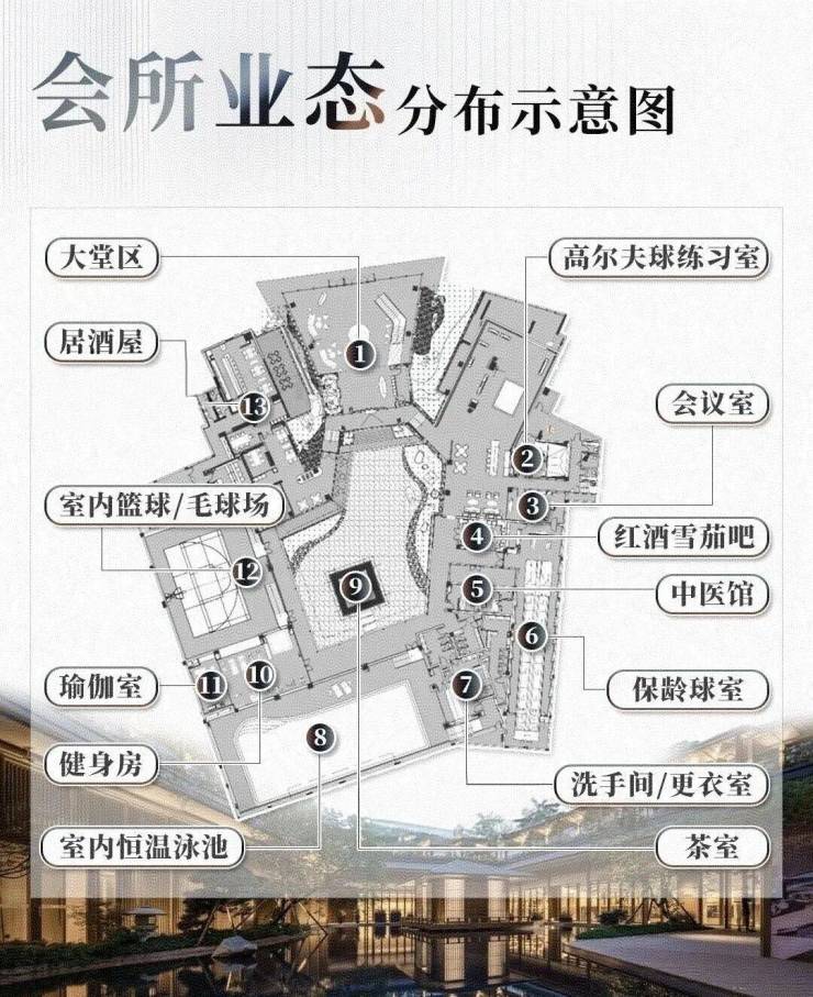 既有常见的恒温泳池、健身房、普拉提室,还有圈层专属配套,比如红酒雪茄吧、保龄球馆、室内篮球羽球混合馆、高尔夫练习室等,基本能满足日常所需。