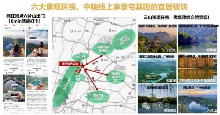 广州中轴线上最具景观资源的一段,白云山、南湖景区、天鹿湖、帽峰山、六片山、龙洞生态景区,六大生态景区环绕,享千万级云山视野。