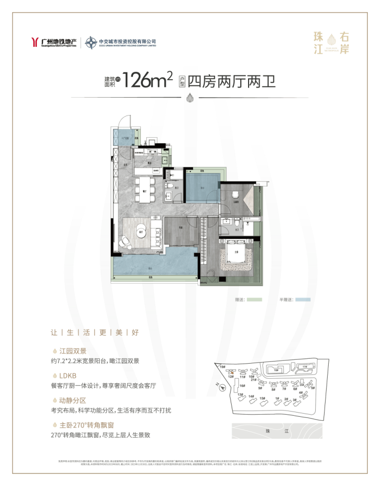 建面约126平四房两卫有横厅和竖厅可选,各具特色。