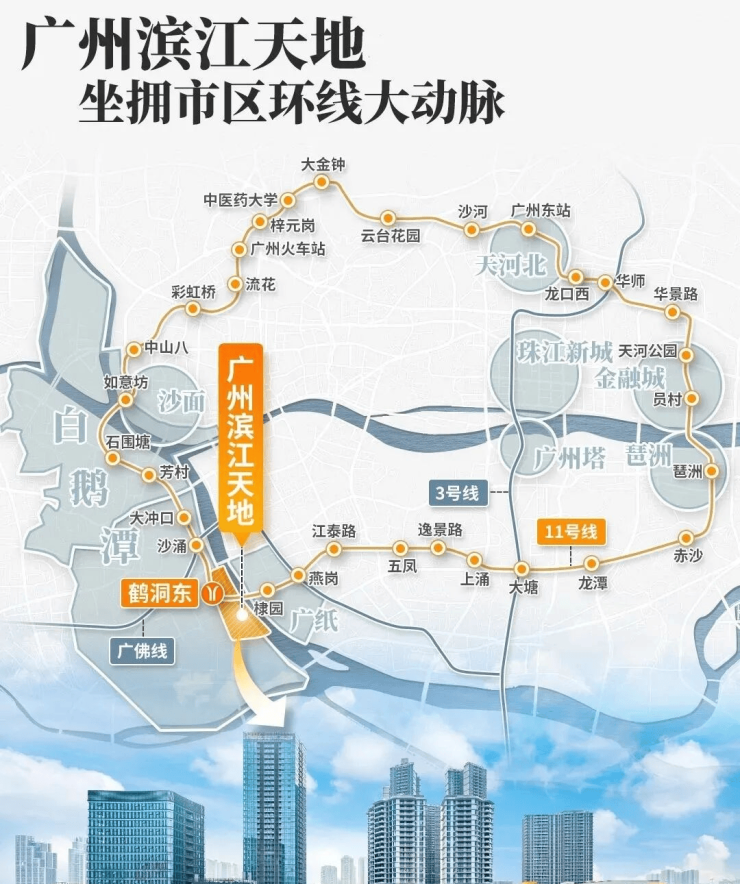 项目门口的地铁11号线鹤洞东站,距离项目直线距离不到200米,规划中的佛山地铁11号线也紧挨项目南侧设站,通过广州首条环线11号线,可以速连珠金琶CBD,也可以在大湾区艺术中心,邂逅艺术的灵感,或漫步老西关永庆坊,感受百年烟火气...