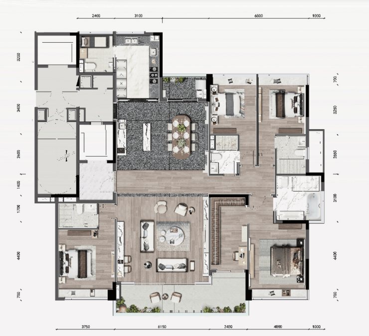 臻颐府的户型设计注重舒适性与实用性,尤其是高层设计和大面积空间的使用,使得每个细节都更显奢华。以265㎡的热销户型为例,采用南北对流设计,四开间朝南,采光效果极佳。每个单元配有3.5米的层高和双阳台设计,约9米的南向景观阳台带来极致视野。此外,290㎡的楼王户型更是全城稀缺,约80㎡的客餐厅、45㎡的主卧和奢华的高层视野,完美诠释了豪宅应有的尺度和气度。
