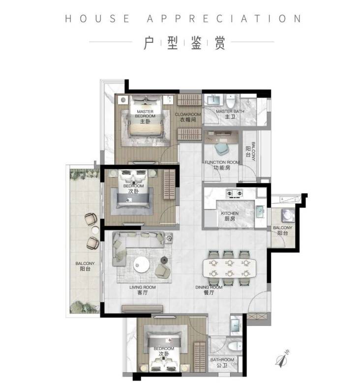 ·南向景观阳台 + 满飘窗,约4m南向主景观阳台,所有房间带飘窗。
