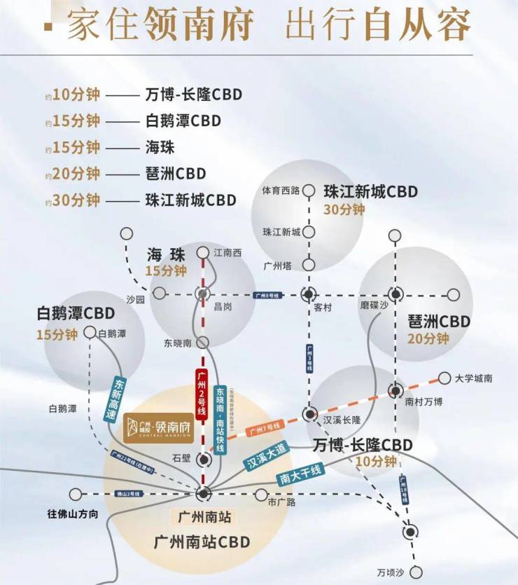 4站至万博CBD、7站至北滘新城、30分钟至珠江新城。广州地铁22号南延线将延伸至深圳沙井站,北延线将延伸至白云机场。