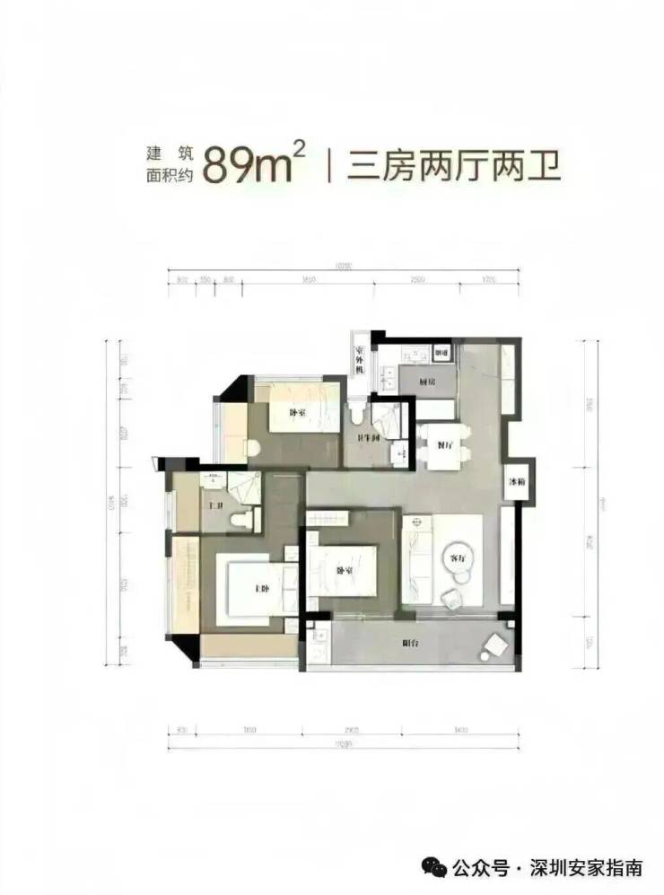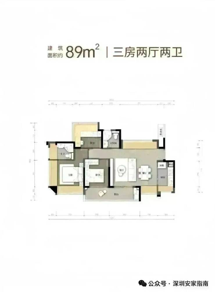 89m²的3房2厅2卫,折后总价335-375万/套,单价3.8-4.28万/m²。