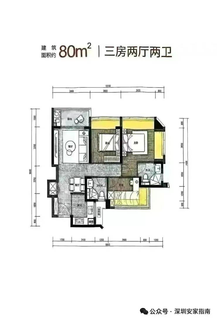 80m²的3房2厅2卫,折后总价298-322万/套,单价3.72-3.98万/m²。