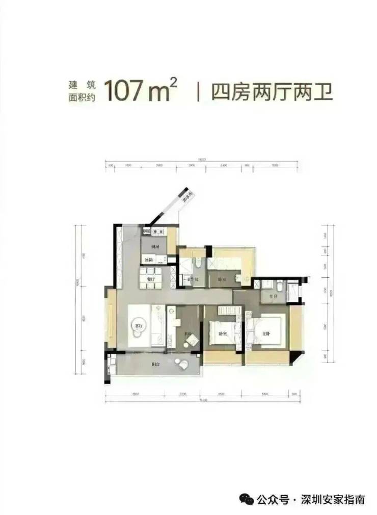 107m²的4房2厅2卫,折后总价429-465万/套,单价4.05-4.38万/m²。