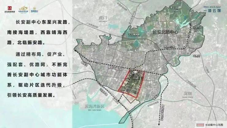 片区建设提速提质长安十四五规划中,长安开始谋划副中心,其落位于滨海湾新区旁,东至兴发路,南接海堤路,西靠靖海西路,北临振安路,辐射金沙站TOD省市合作用地范围;与深圳一水相隔,背靠穗深城际和VIVO全球总部。