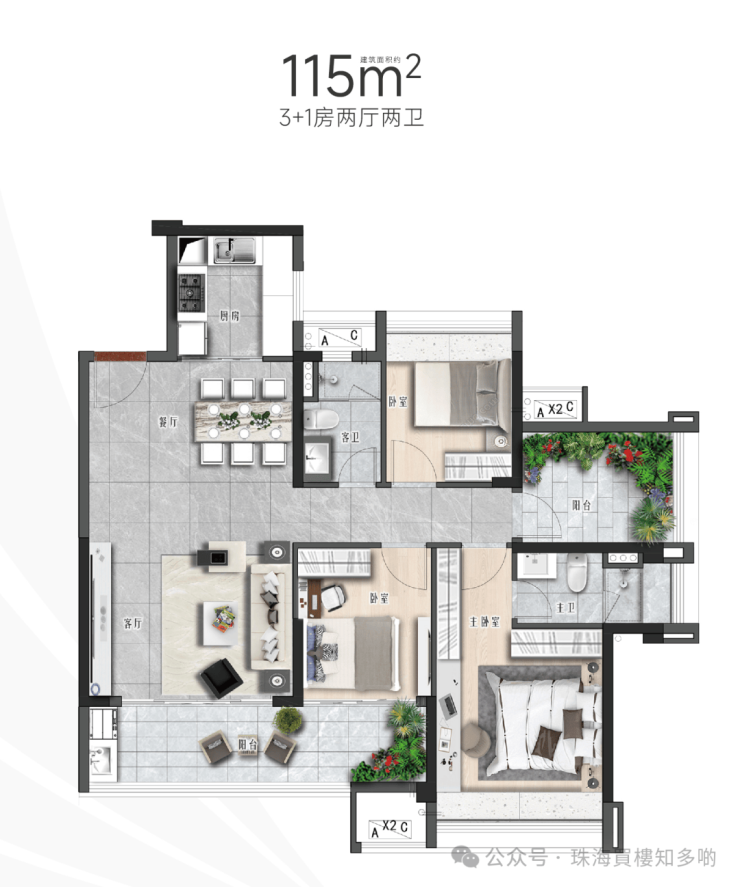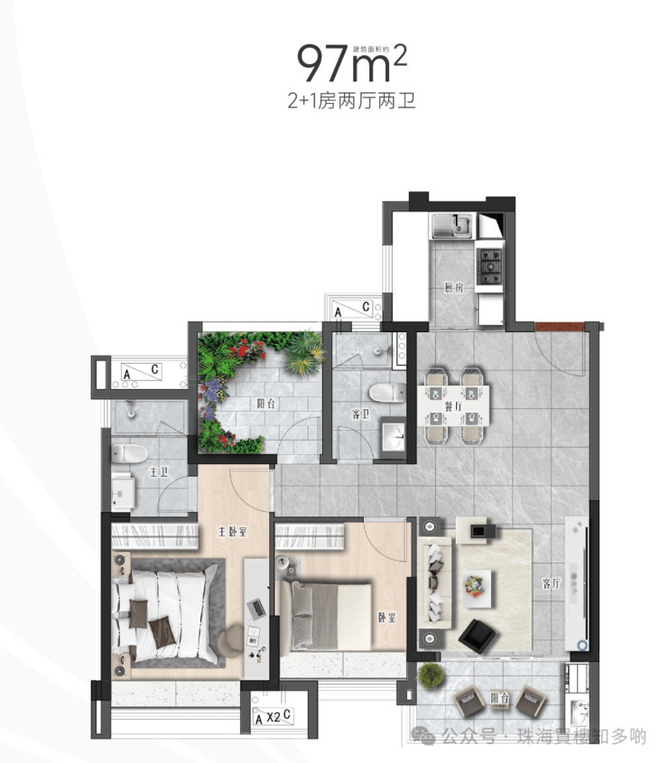②97㎡2+1房,全年龄段三口之家的优选户型,多一间童房/长者房,自享主人房舒适生活,高品质最大化。