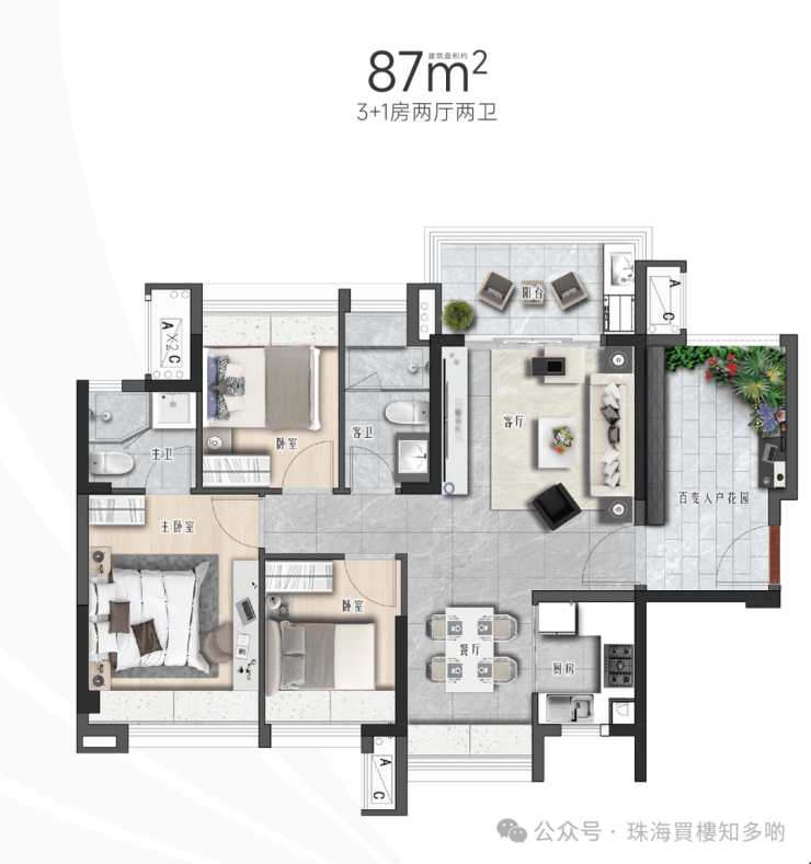 ①87㎡3+1房,买三房享四房,极至实用率领胜市场同类“百变入户花园”轻松变出书房、童房、花园,空间自由度最大化;