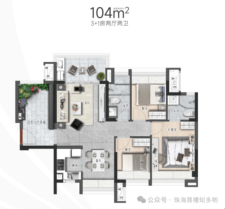 ③104㎡3+1房,升级南北通格局+“百变入户花园”为追求更大空间享受的三代家庭舒适度最大化;