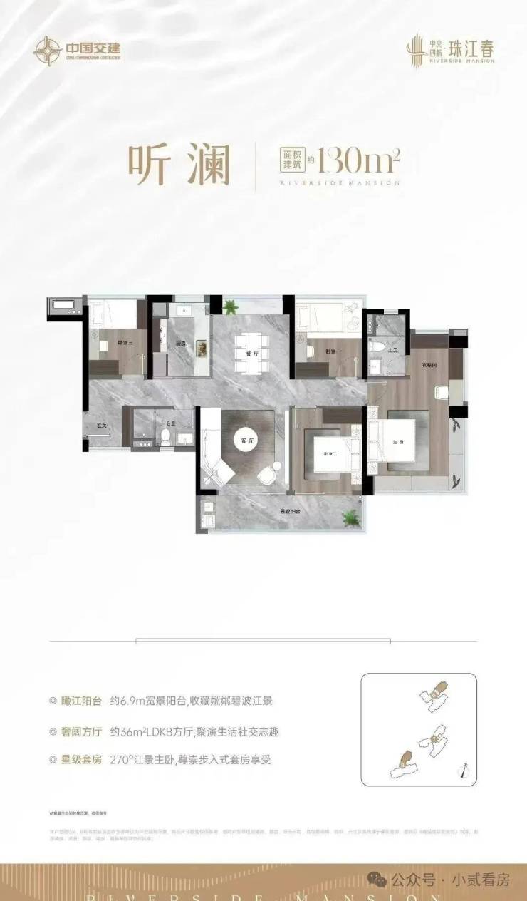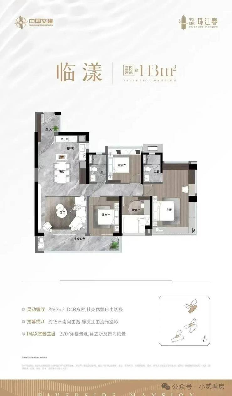 3. 户型设计: 珠江春项目主推130㎡、143㎡、180㎡大户型,均为全南向设计,使用率超110%,提供宽敞舒适的居住空间。