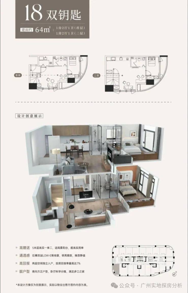 约64㎡,可设计为2+1房2厅2卫(中空设计3+1房2厅2卫(双层设计)。