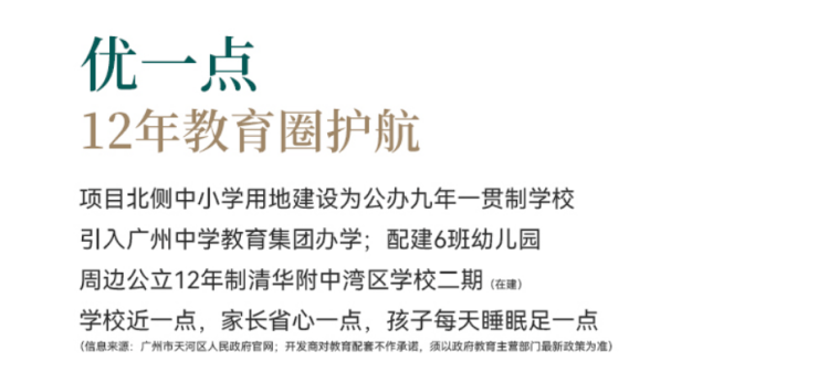 教育资源丰富且优质,项目北侧教育用地将建设公办九年一贯制中小学,并引入广州中学教育集团办学。同时配建 6 班幼儿园,旁边还有 12 年制清华附中湾区学校二期(在建中,预计 2026 年完工),形成全龄段优质教育圈,为孩子成长提供有力保障。