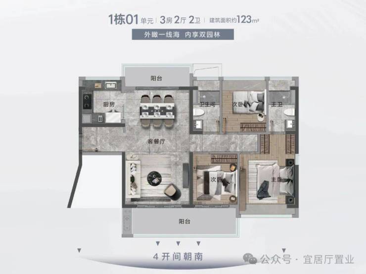 格局:南北对流、5.8 米宽景阳台、主卧套间、U 型厨房