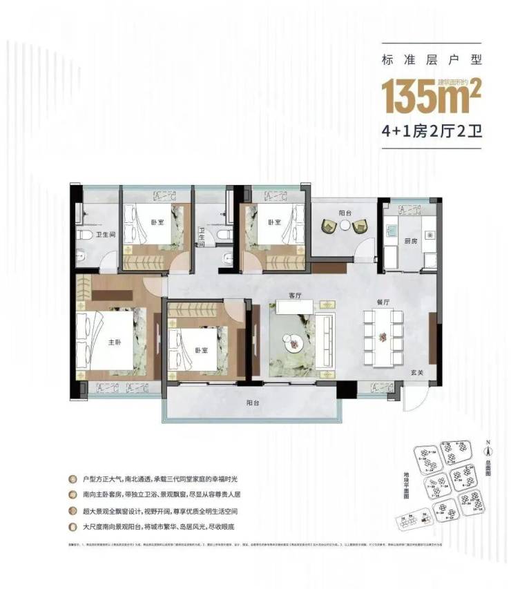 而135㎡户型为横厅设计,南向景观大阳台贯通客厅与次卧,加上主卧、餐厅形成4开间朝南。