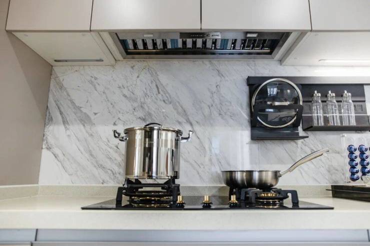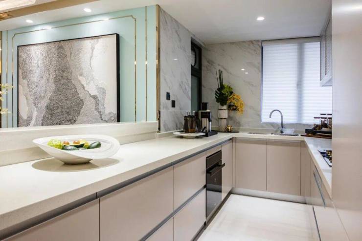 为了使厨房空间更具观赏性,设计师将烟机、冰箱、洗碗机隐藏,厨房整体线条更加流畅。