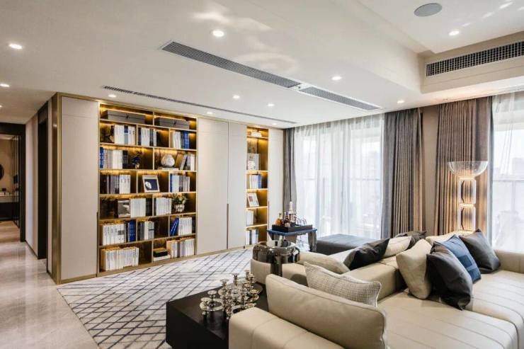 整个客厅空间都选用雅致简约的色调,柜体线条感十足,看起来流畅美观。沉稳的奶油灰烤漆柜配以金属展示格,盛放着千帆阅尽后的气定神闲与优雅。