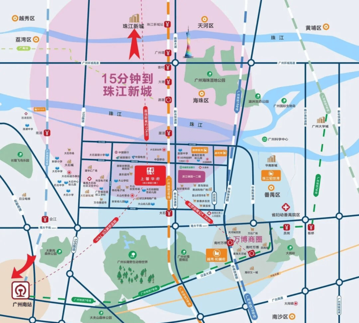 地铁3号线|黄金大动脉3号线大石站,约900米,2站万博CBD/海珠,6站达珠江新城/琶洲。
