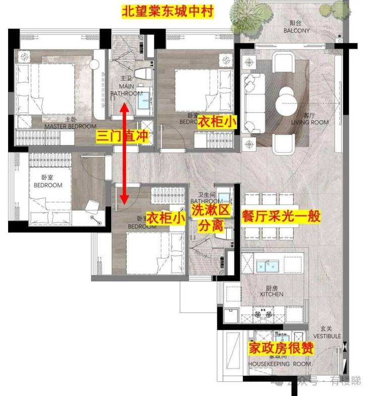 主卧门和次卧门直冲,和主卫门也冲;所有次卧的衣柜位都比较小。