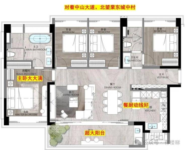 这个横厅的格局,确实比很多楼盘的横厅设计都要好:大阳台顾及了大采光,厨房和餐厅互动性又强,公卫和餐厅错开没直冲,主卧够大,主卫还做了两个洗手盆耶~