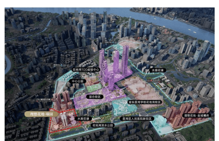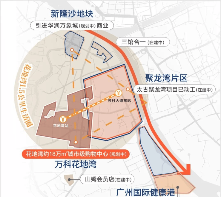 此外花地湾片区基本都是由万科统一开发,汇合白鹅潭-花地湾-聚龙组团的板块张力,白鹅潭核心区、聚龙组团、花地湾组团,于半径约2KM内构建珠江西岸CAZ黄金三极。