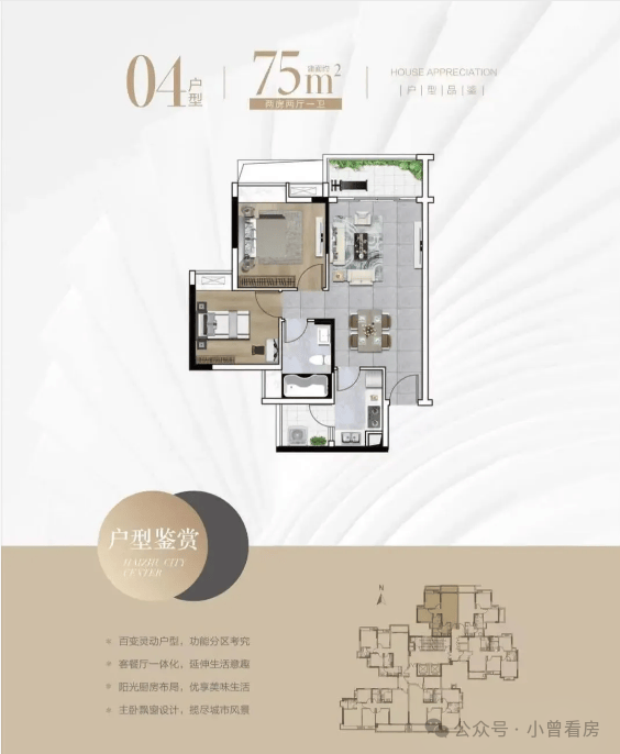 75㎡两房两厅一卫是刚需首选,适合新婚夫妻或三口之家。客厅连南向阳台采光佳,主卧带飘窗空间充足,次卧可灵活改造成儿童房或书房;U型厨房动线流畅,实用又舒适。