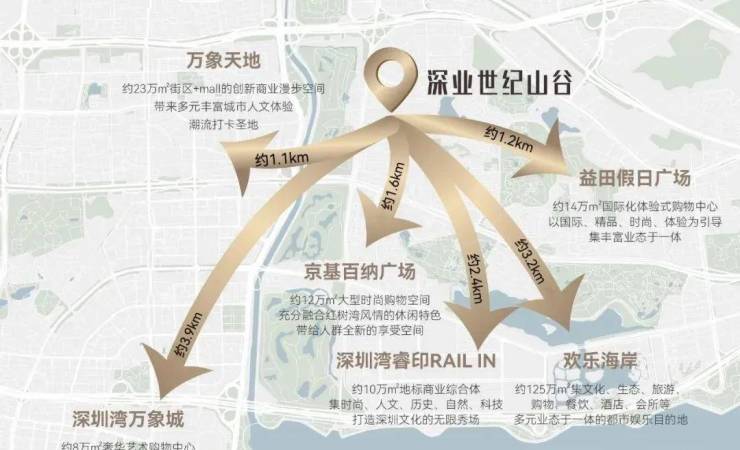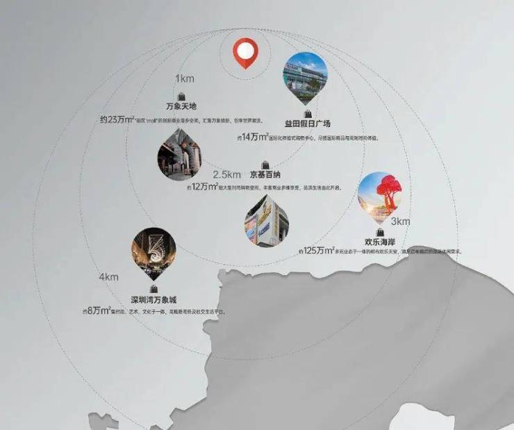 1公里范围内有益田假日广场、万象天地、京基百纳广场三大商圈环绕;车程约十分钟即可到达深圳湾睿印、欢乐海岸、深圳湾万象城,可满足日常休闲娱乐。