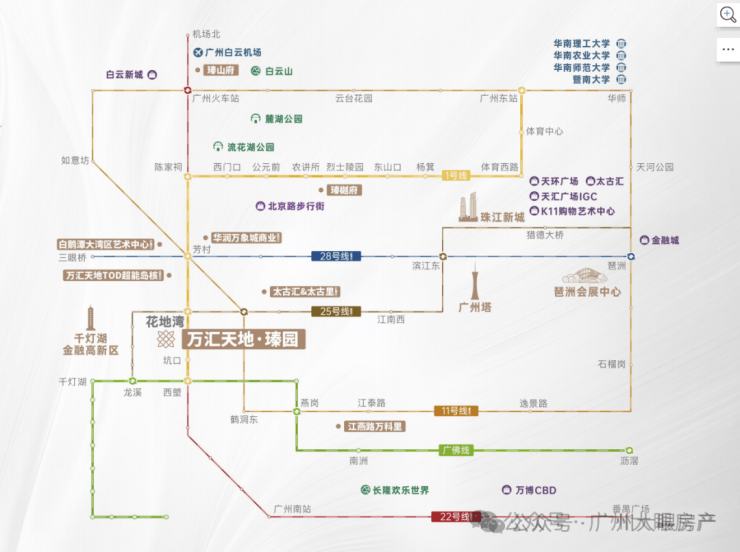 项目附近有花地湾TOD枢纽,属于地铁1号线、25号线花地湾站的交汇换乘点,距离地铁花地湾站约800米左右,步行需12分钟,1个站到达芳村TOD可换乘11、22号线地铁,11号线还是打通广州地铁线网的“换乘之王”,全线32个站点中,有26个为换乘站,16个与既有线路换乘,从项目出发去往广州各区都很方便