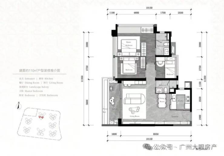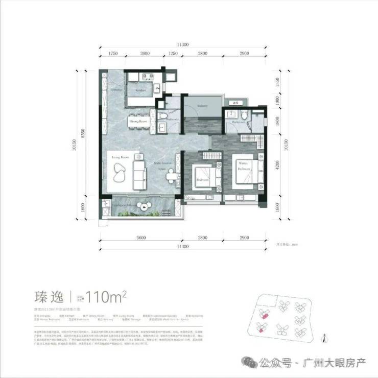 建面约𝟏𝟏𝟎m²户型【可改四房】,全开间朝南 约𝟏𝟏.𝟑米南向采光面