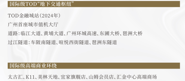 ✨世界级交通枢纽,临江大道直达珠城:10分钟珠江新城,15分钟琶洲,金融城TOD(全国最大地下空间),15分钟南站,20分钟白云机场。