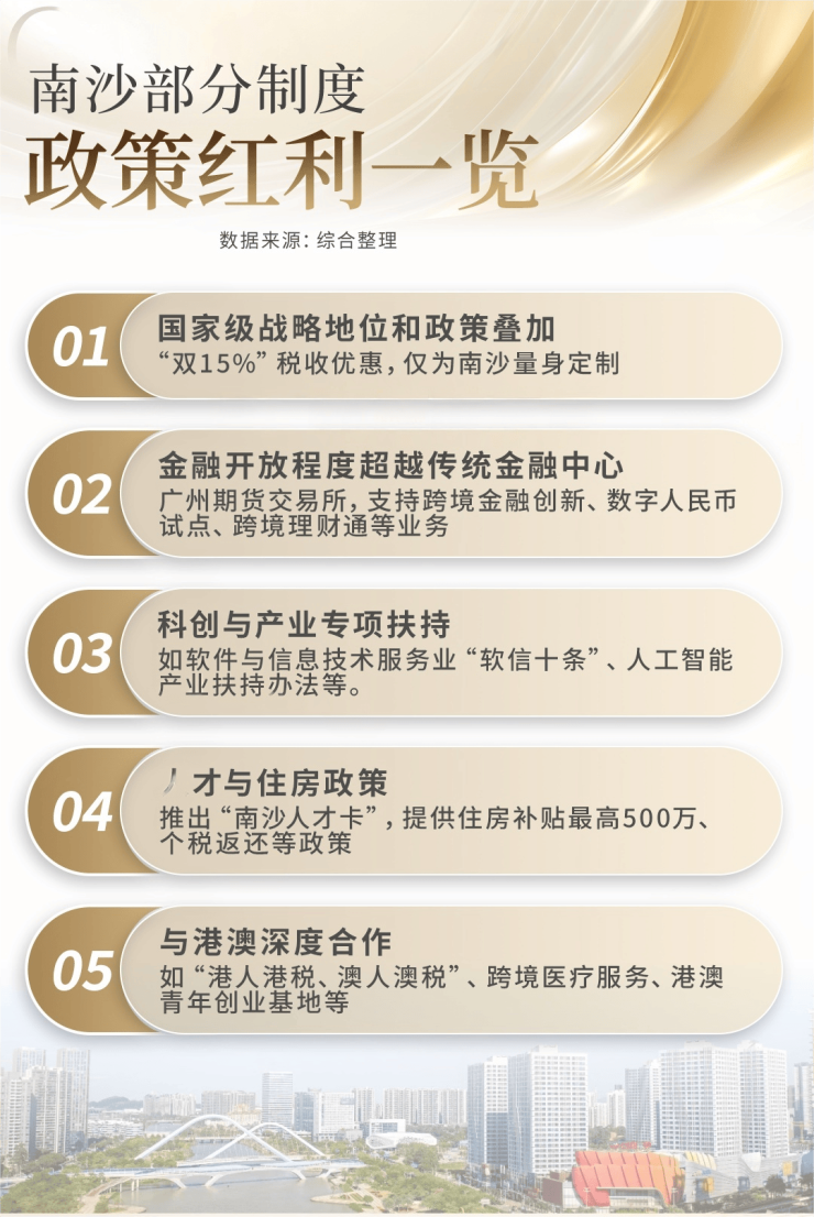 产业项目从拿地到投产最快仅需12天,“双15%”税收优惠南沙独有,人才绿卡虹吸高端人才,与港澳合作深度远超其他区。