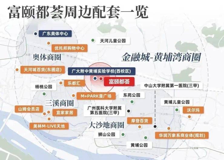 4大医疗保障:中山大学附属第一医院(三甲)、广州医科大学附属第五医院(三甲)、广州市黄埔区中医医院、天河第二人民医院(规划中)。