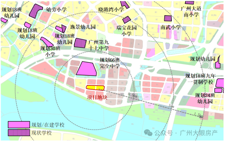 1千米范围内有广州第九十七中学,1.5千米范围内有南武小学等,距离地块