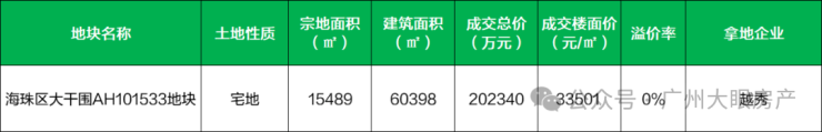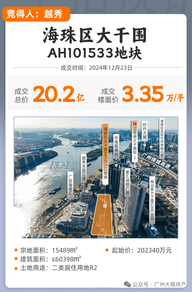 2024年12月23号,海珠大干围地块被越秀以20.23亿元拿下,楼面价为33501元/㎡。