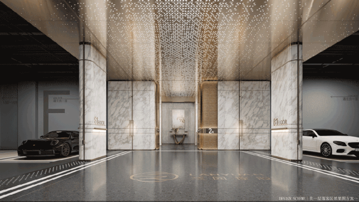 作为另一个业主的归家入口,地下停车场,也延续了入户大堂的高品质规格。墙面及柱体全部铺设鱼肚白大理石,地面甚至之间舍弃了地坪漆,而是选用天然大理石铺设;